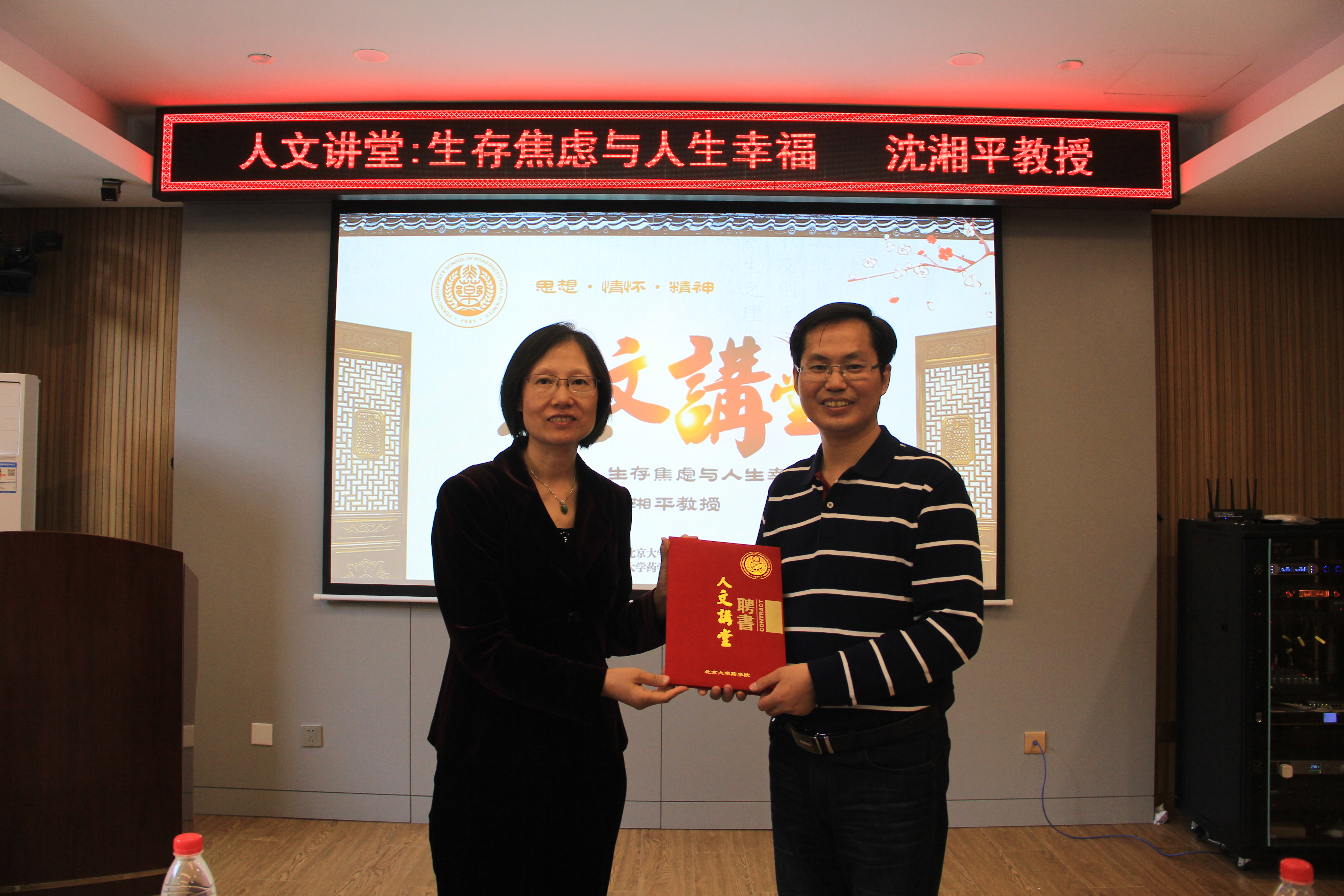 图8:yl6809永利官网党委书记徐萍为沈湘平教授颁发人文讲堂指导老师的聘书