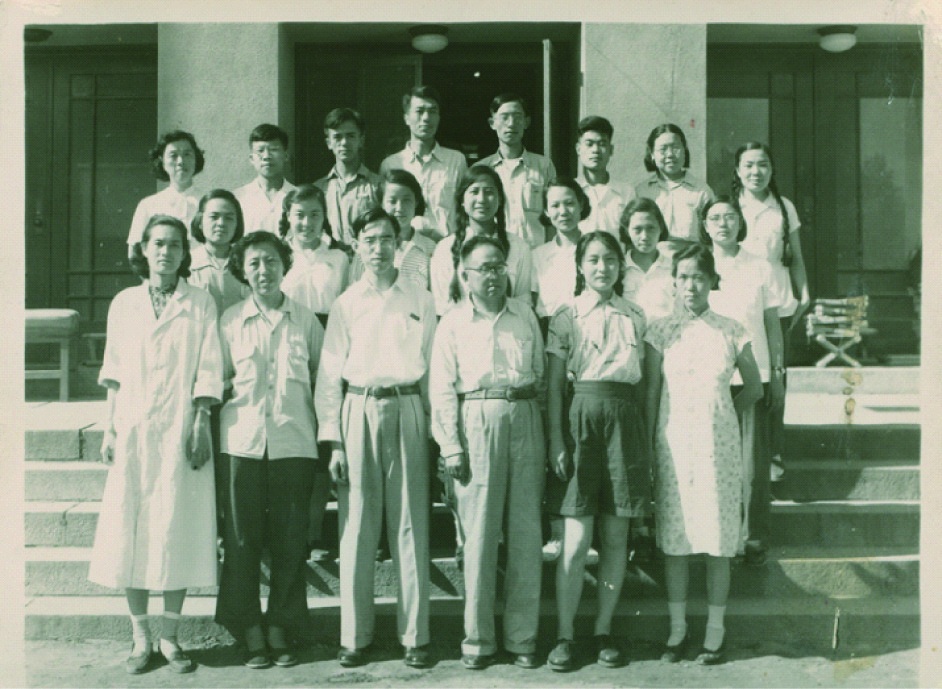 (前排左起:沈节、诚静容(植物学副教授)、楼之岑(生药学副教授)、薛愚(药学系主任)、李胜华(生药学助教)、张卓英;二排左起:王美玉、谢玉如、秦佩芬、韩桂秋、田珍、刘美兰、曾美怡;后排左起:沈圆、谢长春、章国镇、洪潜、李珍灼、王成群、李家实、樊菊芬)