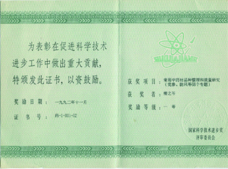 改革开放后,他积极投身于祖国的经济建设。1981年,楼老与中国药科大学生药学教授徐国钧先生徐老(图3)共同倡议立项并领导了在中国中药事业发展史上值得写下浓重一笔的题目为“常用中药材品种整理和质量研究”的国家“七五”“八五”科技攻关项目。该项目从本草考证与文献综述、药源调查、动(植)物鉴定、性状组织、商品鉴定、化学成分、理化鉴定、药理实验、定量分析、采收加工等10个方面对具有品种混乱问题的中药材进行系统研究。“七五”期间(1986—1990年)和“八五”期间(1991—1995年),楼老任北方协作组组长,徐老任南方协作组组长,全国共有二十多个单位的500余名工作者参与科研协作。其间,楼老亲自指导教师、学生对麻黄等30多种(类)中药进行了系统的研究。南北方协作组一共联合完成了220种(七五123种,八五97种)具有混乱品种问题的中药材的研究。该国家攻关项目历时10年,在研究方法上和研究内容上开创了中药研究的先河,为我国常用中药材的品种整理、品质评价和开发利用作出了重大的贡献。七五攻关成果于1992年荣获国家科技进步奖一等奖(图4),这是我国中医药领域第一个国家科技进步一等奖;八五攻关成果于1997年再次获得国家科技进步奖。这些科研成果迄今为止一直是我国中药现代化专项研究项目的重要基础。